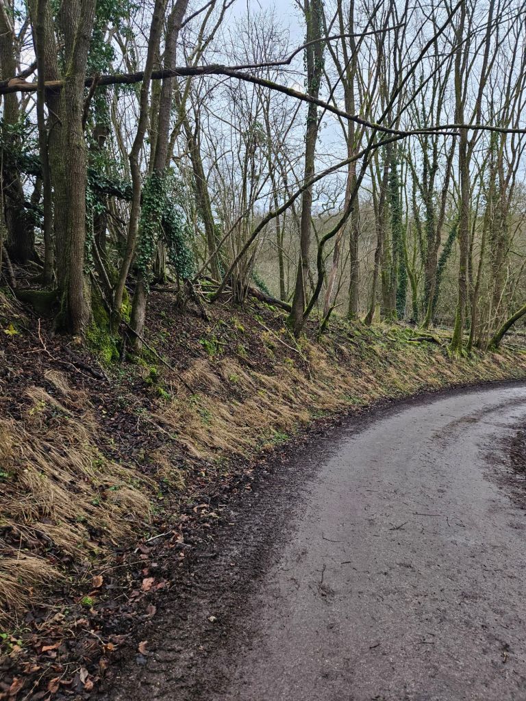 Follow the path through the woods and keep heading straight, and then downhill until you reach a large gate at the end of the wood. Go through the small gate to the side and turn right, following the narrow, winding, road. When the road forks, bear right. Walk through the trees and past the stream.