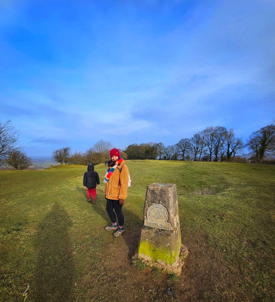 Keep on ignoring all paths branching off, and follow the way markers through the pasture (there are two) until you reach the top of Dover’s Hill, marked with a National Trust trig point stone. Walk left along the top of the hill, admiring the magnificent views.