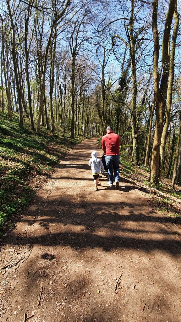 If you keep following the track to the left you will see signs for the Cotswolds Way that takes you through a kissing gate and in to Stanley Wood. Stanley Wood had a large pretty track through the woodland, it has masses of bluebells in the spring followed by fragrant white wild garlic flowers in May. However bear in mind there is a steep drop off on the side of this woodland path so its not so great for letting little ones roam freely, but we always managed fine with our toddlers under some closer supervision.
