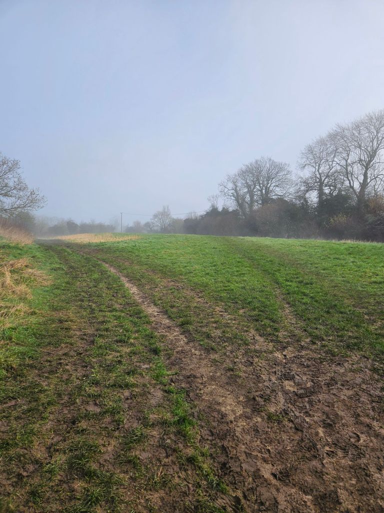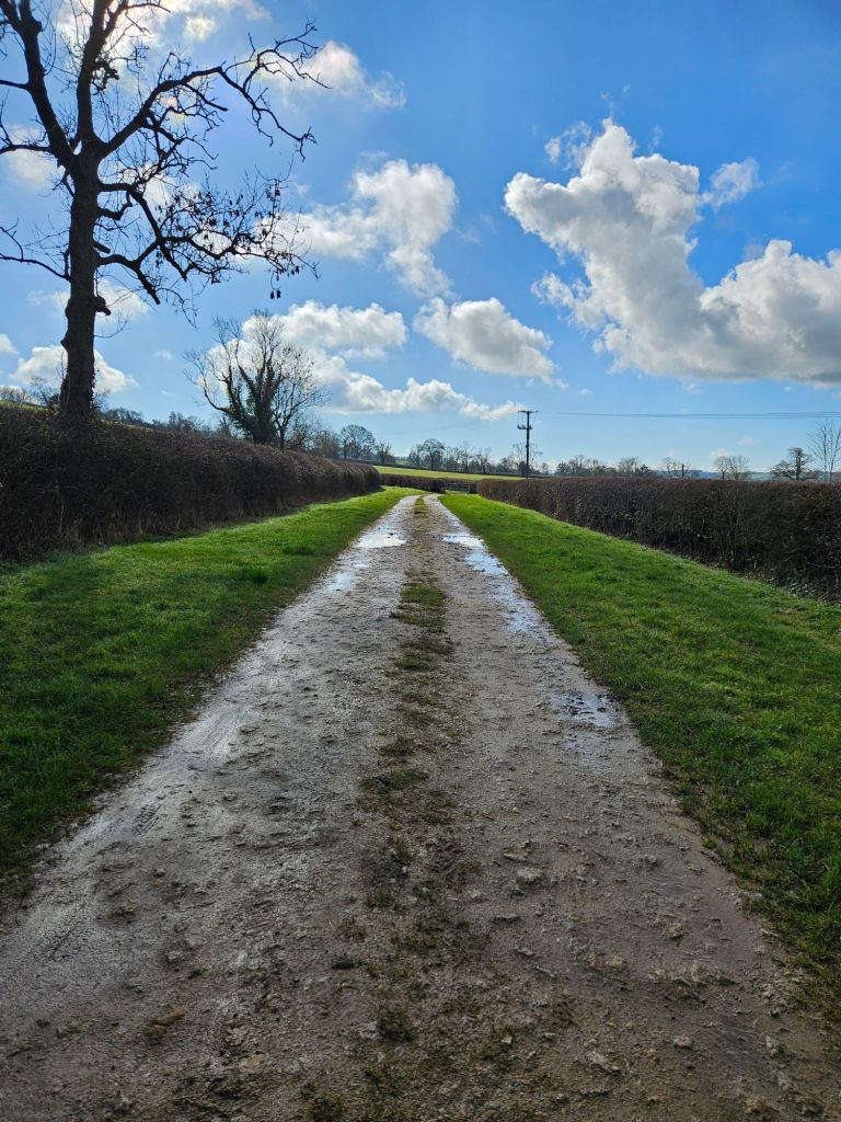 Follow the track along the edge of the field. At the end of the field, the path takes you left. It’s pretty straightforward and a clear path to keep following. You will go through 3 gates and fields until you reach a stone driveway. Turn right and walk along it.
